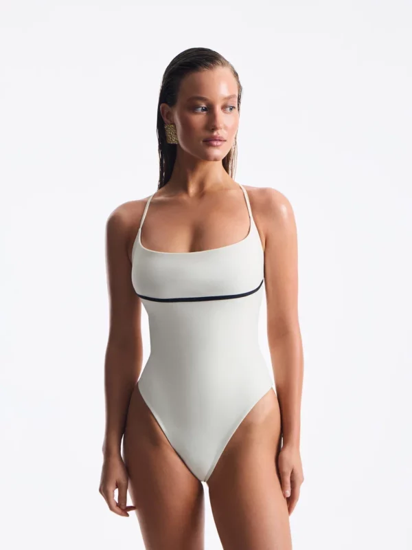 Передняя часть купальника акцентирует внимание на зоне декольте благодаря канту в виде горизонтальной линии, расположенной под грудью. Этот элемент не только визуально подчеркивает форму груди, но и обеспечит ее поддержку при этом, создавая эффект пуш-ап.